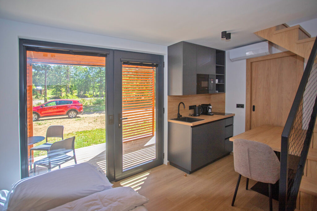 - Obývací část s kuchyňským koutem: Srdcem apartmánu je příjemná obývací zóna s pohodlným nábytkem, která plynule přechází do moderního kuchyňského koutu. Plně jsme ho vybavili lednicí, mikrovlnnou troubou, varnou deskou, kávovarem a rychlovarnou konvicí. Samozřejmostí je i kompletní sada talířů, hrnečků, sklenic, pánví a hrnců, takže si můžete snadno připravit svá oblíbená jídla.