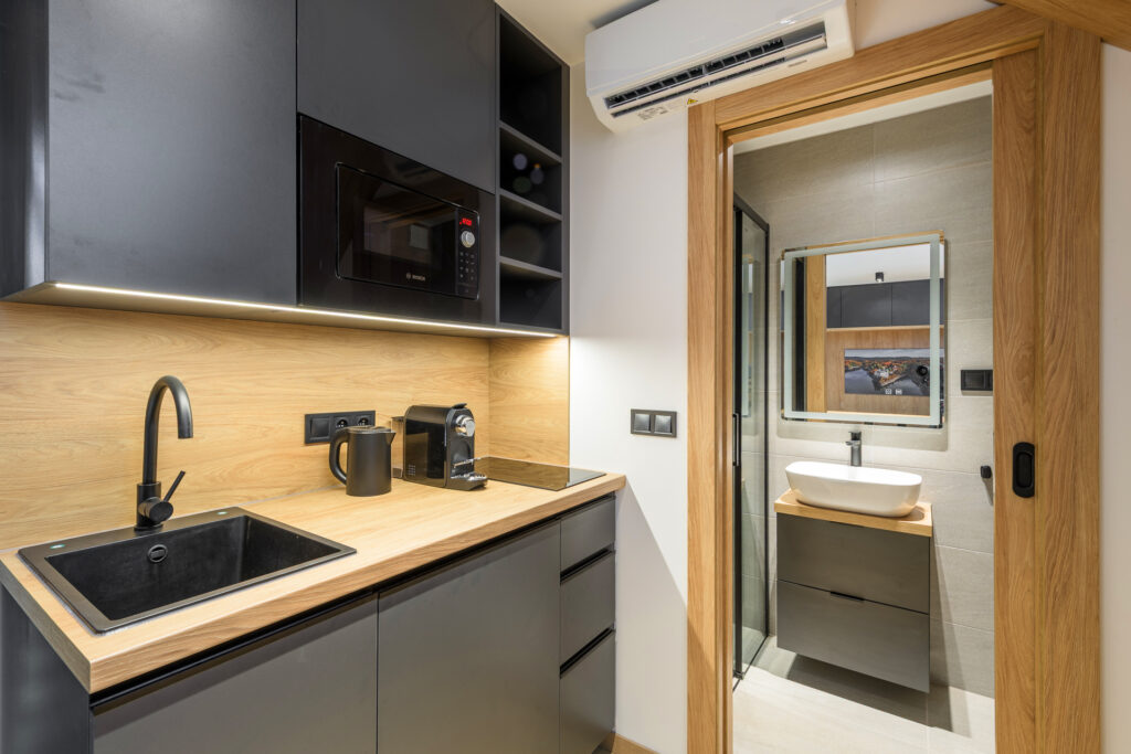 - Kuchyňský kout s obývací částí: Srdcem apartmánu je praktický a menší kuchyňský kout, který je plně vybavený pro přípravu lehkých jídel. Najdete zde lednici, mikrovlnnou troubu, varnou desku, kávovar a rychlovarnou konvici. Samozřejmostí je i kompletní sada talířů, hrnečků, sklenic, pánví a hrnců. V této části se nachází i pohodlná menší válenda, která slouží jako třetí lůžko a zároveň jako místo k posezení.