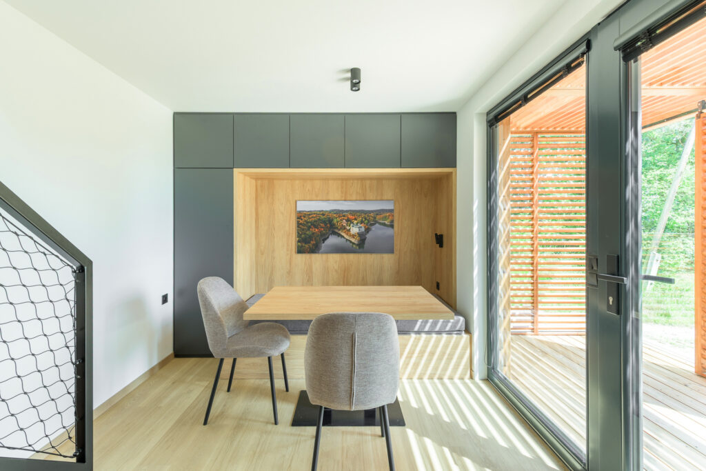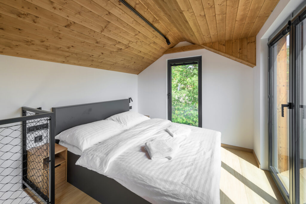 Hledáte dokonalé útočiště pro rodinu u břehů Orlíku? Apartmán 3 spojuje maximální útulnost a funkčnost, aby vyhověl třem osobám. Nabízí příjemné zázemí pro ty, kdo touží po klidném odpočinku v srdci přírody. A zároveň chtějí mít vše potřebné po ruce. Tento apartmán leží blíže k příjezdové cestě, což zajišťuje snadný přístup, a vedou k němu útulné dřevěné schůdky.