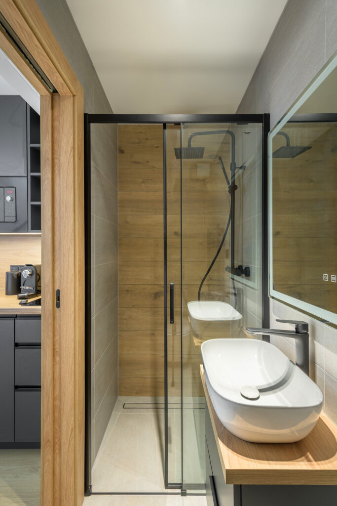 - Terasa s prosklenou výplní: Součástí apartmánů je i soukromá terasa s elegantními skleněnými výplněmi místo zábradlí, ideální pro ranní kávu s výhledem, nebo večerní posezení venku s pocitem většího prostoru a volnosti.
